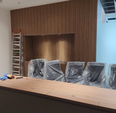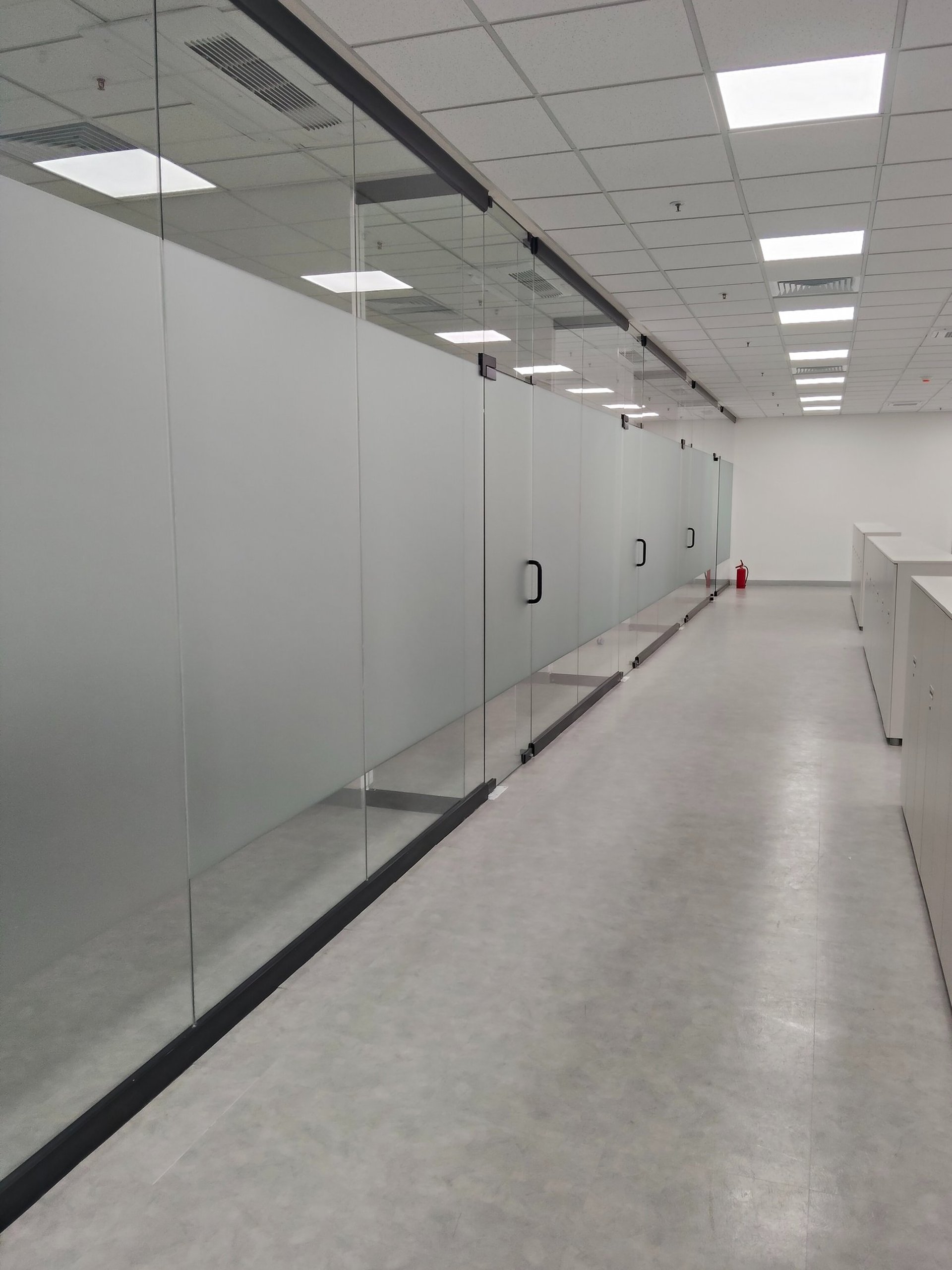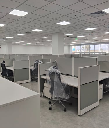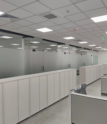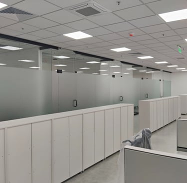 Se realizó el proyecto de interiorismo, en el cual se diseñaron oficinas con divisiones construidas de muros de Tablaroca y frentes de cristal templado. En toda el área se instaló piso vinílico de alta resistencia, además de mobiliario ergonómico y funcional, logrando así un ambiente moderno y completamente empresarial.